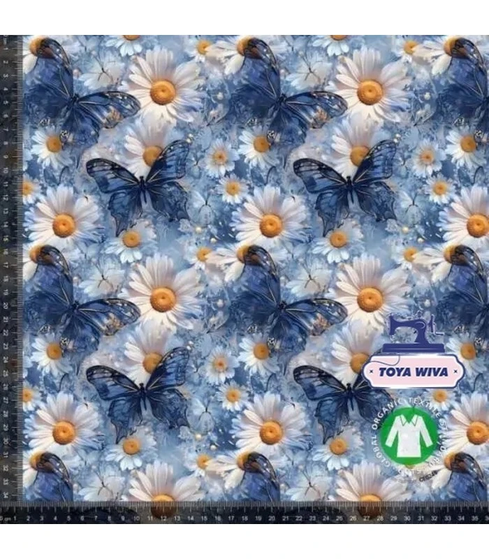 Smuk bomuldsjersey med blå sommerfugle og blomster på lys bund. Kraftig 220 g/m² Økotex kvalitet.