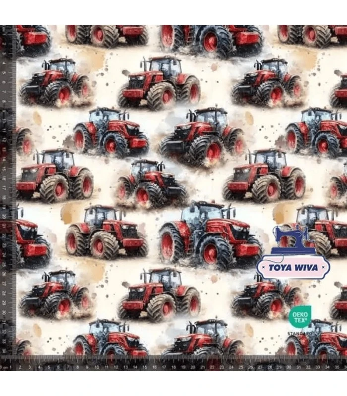 Skøn og kraftig bomuldsjersey med flotte røde traktorer i digitalprint. Et perfekt valg til børn, der elsker bondegård, maskiner og store køretøjer.