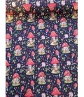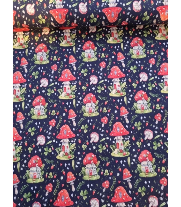 Smuk og eventyrlig bomuldsjersey med fine svampe og små naturdetaljer på en dyb marineblå baggrund. Et stemningsfuldt print, der passer perfekt til både børn og voksne.