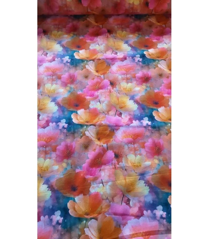 Smuk digitalprintet bomuldsjersey med farverige akvarelblomster i pink, orange og bløde pastelfarver. Et elegant og feminint stof der egner sig perfekt til kjoler, bluser og andet tøj.