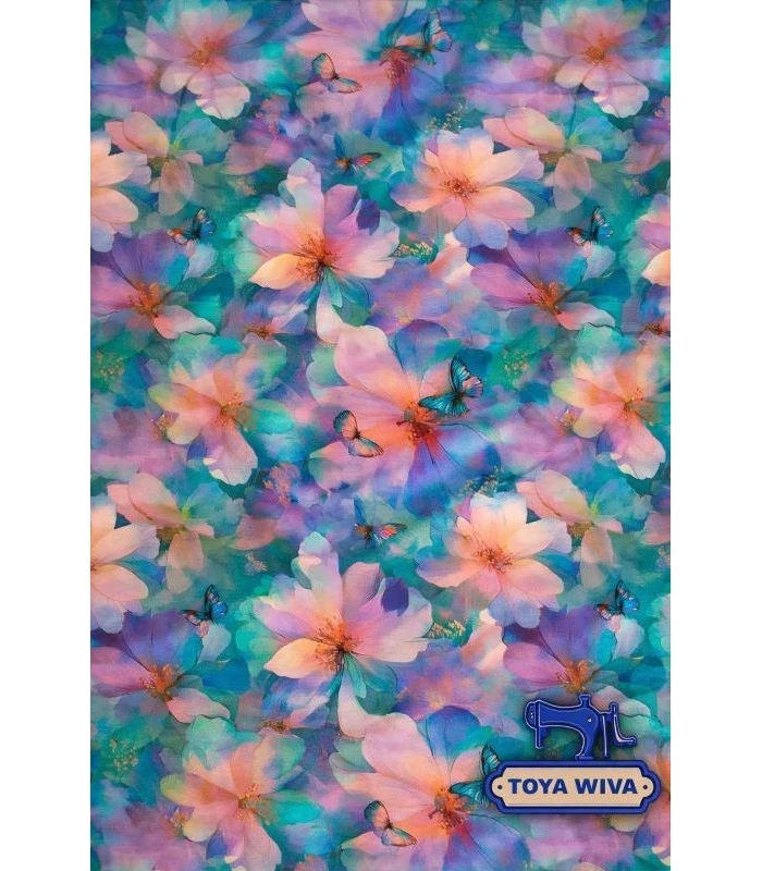 Smuk bomuldsjersey med akvarelinspirerede blomster i flotte pastelfarver og fine sommerfugle. Et let og drømmende print som er perfekt til pigetøj og kreative syprojekter.