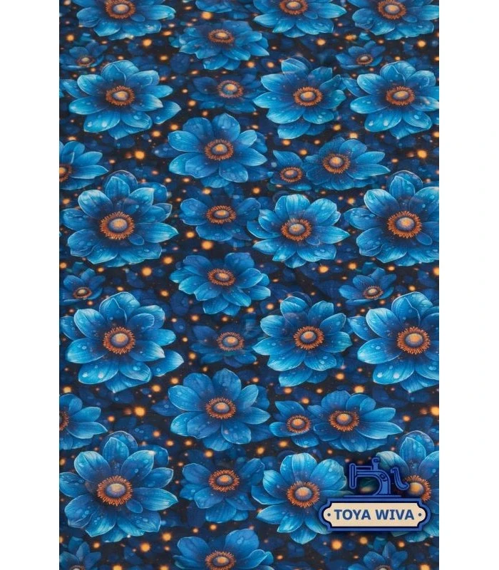 Flot digitalprintet bomuldsjersey med smukke blå blomster på mørk baggrund. Et elegant og farverigt stof der er perfekt til kjoler, bluser og andre kreative syprojekter.