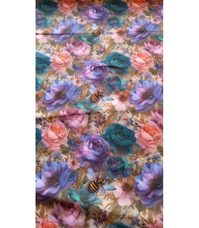 Smuk digitalprintet bomuldsjersey med romantiske blomster og fine bier. Et elegant og feminint stof som er perfekt til kjoler, bluser og andre kreative syprojekter.