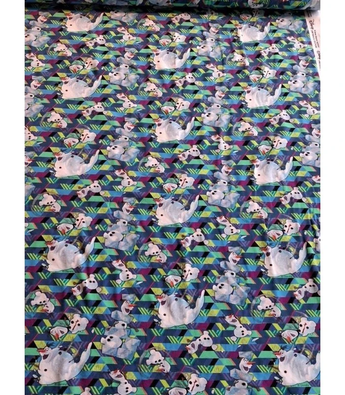 Sjov bomuldsjersey med Olaf fra Disney Frost på en farverig geometrisk baggrund. Et livligt og sødt print som er perfekt til børnetøj til små Frost fans.