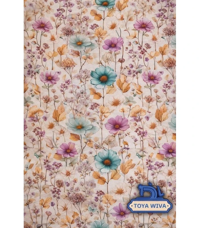 Smuk digitalprintet bomuldsjersey med fine blomster i lilla, turkis og gyldne nuancer på lys baggrund. Et elegant og let stof der passer perfekt til kjoler, bluser og andre feminine syprojekter.