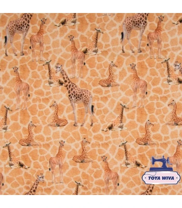 Denne bomuldsjersey med fine giraffer på en varm peach baggrund er et skønt valg til børnetøj og kreative syprojekter.