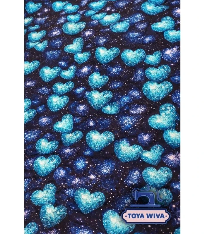 Smuk digitalprintet bomuldsjersey med glitrende hjerter i blå nuancer på en mørk baggrund. Et perfekt stof til pigetøj som kjoler, leggings og bluser – især til en flot fuld sol kjole med et smukt svaj i skørtet.