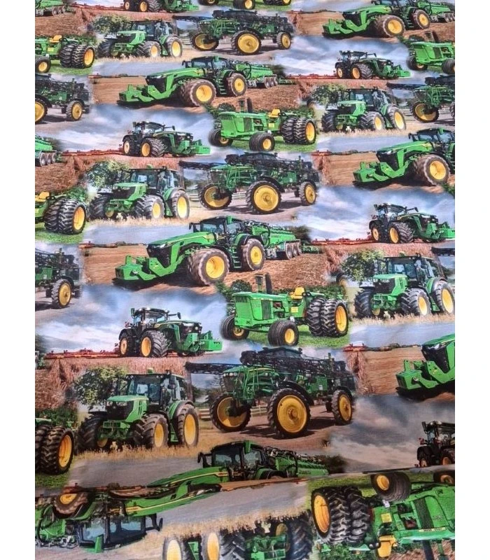 Flot digitalprintet bomuldsjersey med grønne traktorer og landbrugsmaskiner. Et perfekt stof til små traktor- og maskinentusiaster.