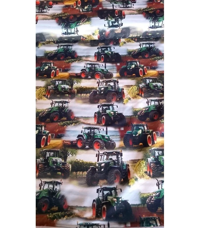 Denne flotte bomuldsjersey er dekoreret med realistiske grønne traktorer ude på marken. Printet giver stoffet et levende og spændende udtryk som især vil begejstre børn der elsker maskiner og traktorer.