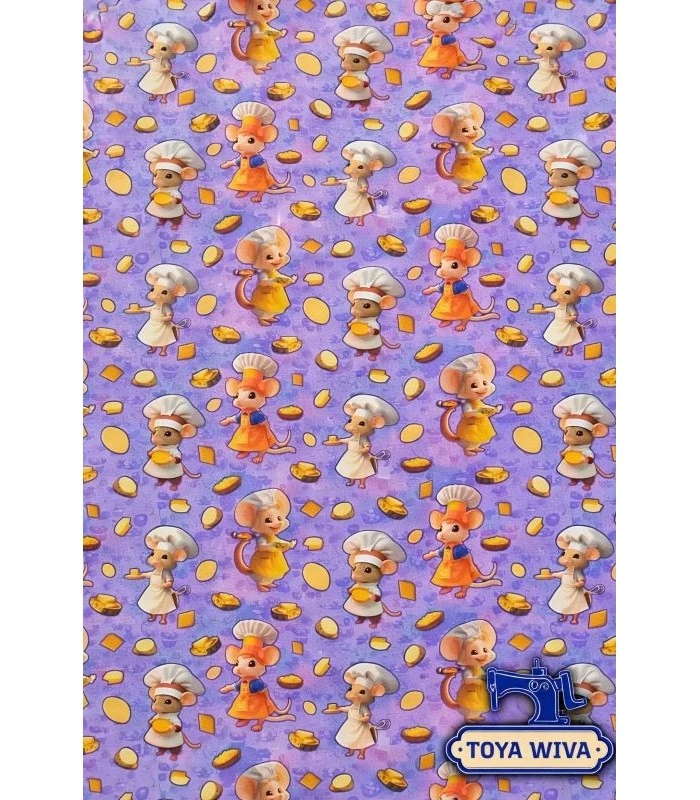 Denne sjove og charmerende bomuldsjersey er fyldt med små kokke mus der laver mad og nyder ost. Det giver stoffet et legende og fantasifuldt udtryk, som gør det perfekt til børnetøj.