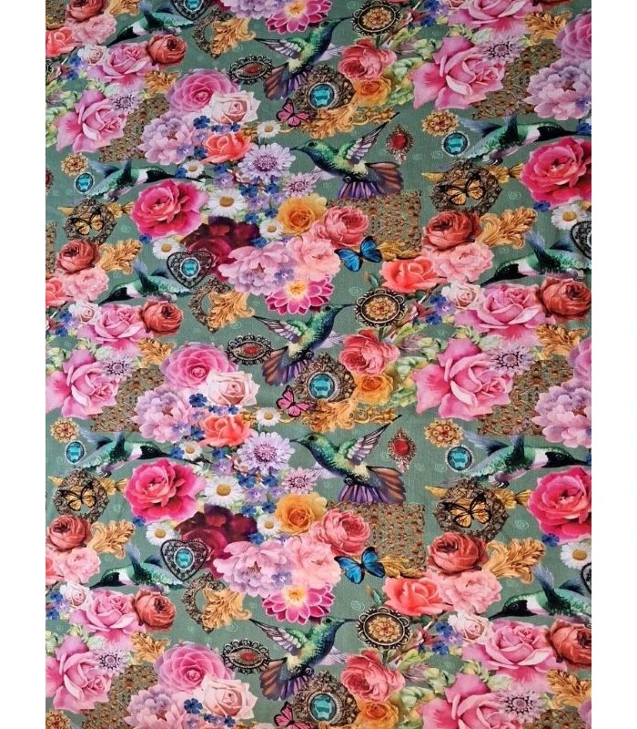 Denne smukke bomuldsjersey har et detaljeret og farverigt print med kolibrier, blomster, sommerfugle og dekorative elementer. Den grønne baggrund fremhæver de flotte rosa og gyldne nuancer i blomsterne og giver stoffet et elegant og romantisk udtryk.