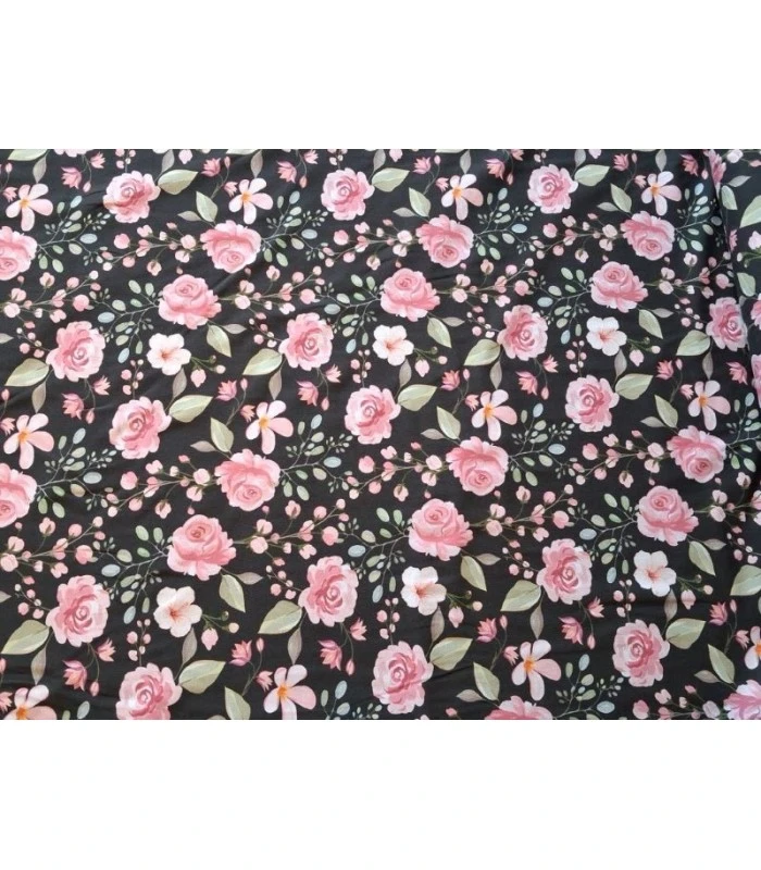 Denne smukke bomuldsjersey har et romantisk blomsterprint med lyserøde blomster og fine grønne blade på en mørk bund. Printet giver et elegant og feminint udtryk, som passer perfekt til både børnetøj og tøj til voksne.
