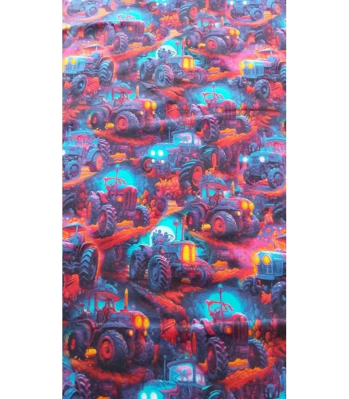 Denne flotte bomuldsjersey er dekoreret med detaljerede traktorer i stærke neonlignende farver på en mørk baggrund. Printet giver stoffet et spændende og dynamisk udtryk, som er perfekt til børn der elsker maskiner og traktorer.