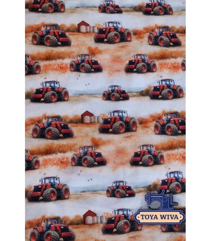 Denne flotte bomuldsjersey er dekoreret med røde traktorer der kører rundt på markerne. Det fine landskab og de detaljerede traktorer giver stoffet et hyggeligt og livligt udtryk som er perfekt til børn der elsker traktorer og landbrug.