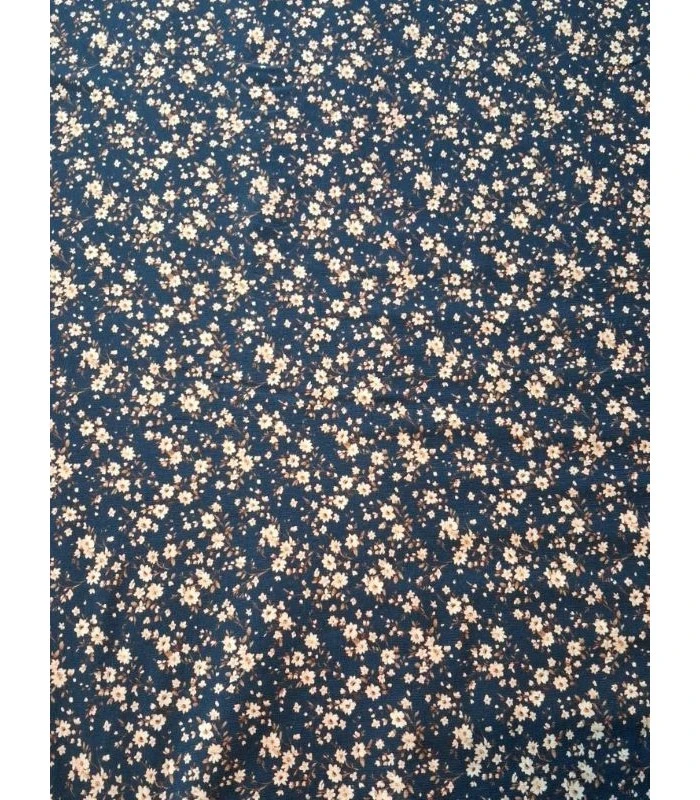 Denne flotte bomuldsjersey har et klassisk print med mange små blomster på en mørkeblå baggrund. Det enkle og elegante mønster giver stoffet et roligt og tidløst udtryk som er perfekt til både børn og voksne.