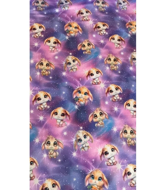 Sød bomuldsjersey med små nuttede kaniner på en smuk stjernehimmel i lilla og rosa nuancer. Et fantasifuldt og eventyrligt print der er perfekt til børnetøj og kreative syprojekter.