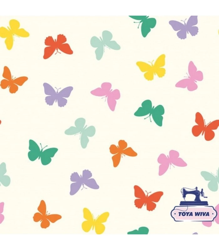 De enkle og stilrene sommerfugle i forskellige farver giver stoffet et moderne og legende udtryk, som egner sig særligt godt til børnetøj.