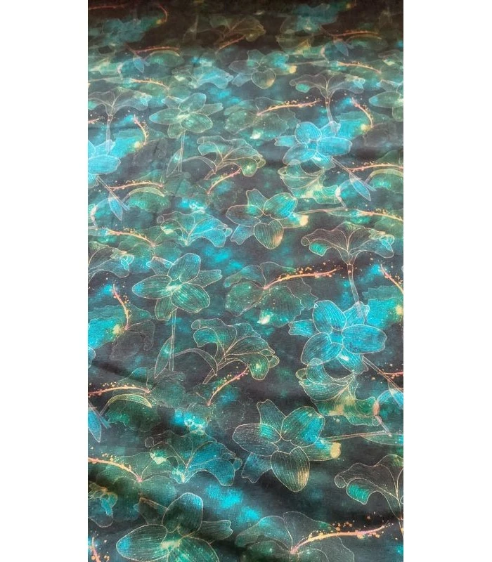 Elegant digitalprintet bomuldsjersey med smukke turkise blomster og fine gyldne detaljer på en mørk baggrund. Et eksklusivt og feminint stof der egner sig perfekt til kjoler, bluser og andre kreative syprojekter.
