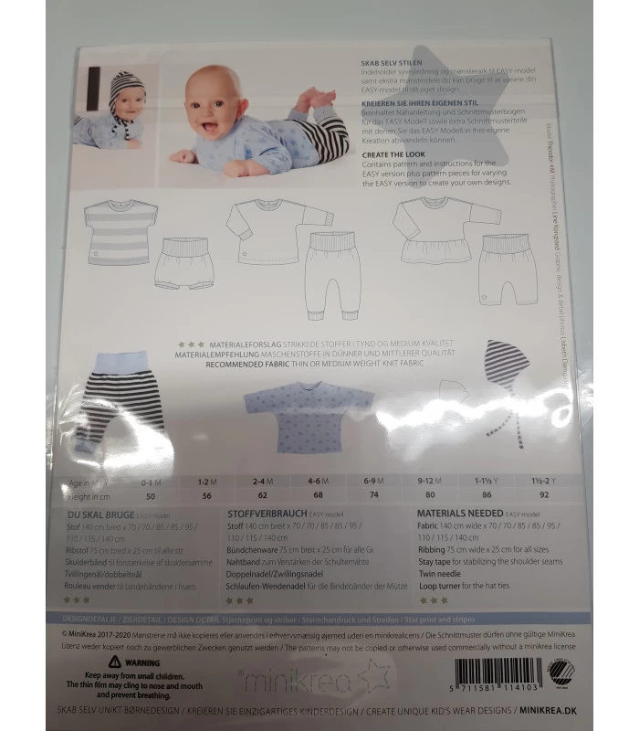 Minikrea 11410 er et sødt og praktisk babysæt symønster med bluse, bukser og matchende hue i str. 0-3 år. Perfekt til blød jersey og babyens første garderobe.