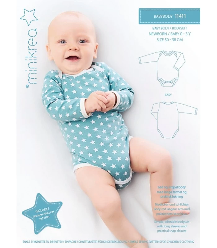 Minikrea 11411 er et alsidigt babybody symønster med både klassisk body, amerikansk lukning og bodykjole. Perfekt basis i str. 0-3 år - ideel til blød jersey