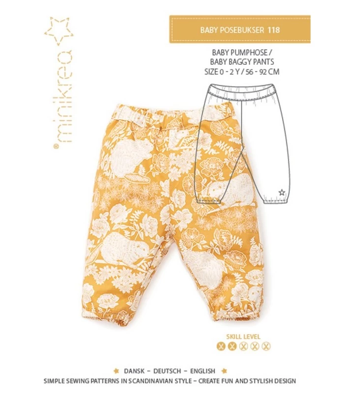 Minikrea 118 er et symønster til bløde baby posebukser med god plads til ble og masser af bevægelsesfrihed. Perfekt til hverdagsbrug i jersey og bløde kvaliteter.