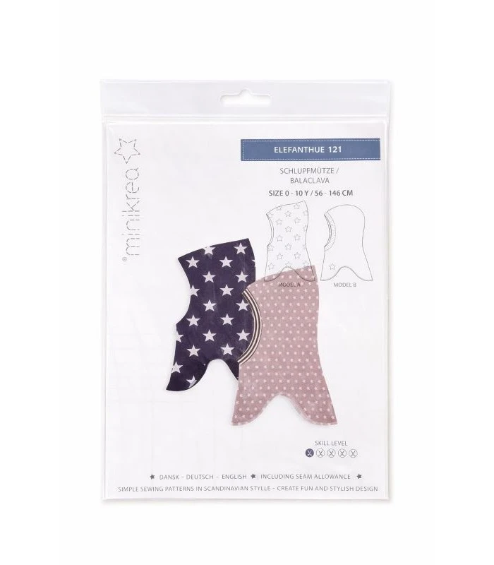 Minikrea 121 er et symønster til klassisk elefanthue (balaclava) til børn i str. 0-10 år. Perfekt til efterår og vinter i jersey eller fleece.