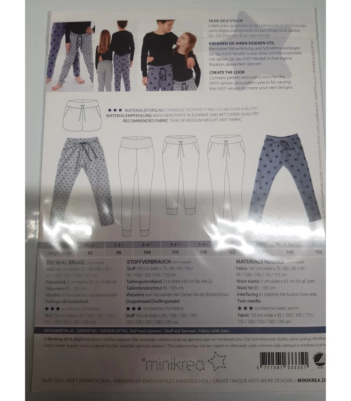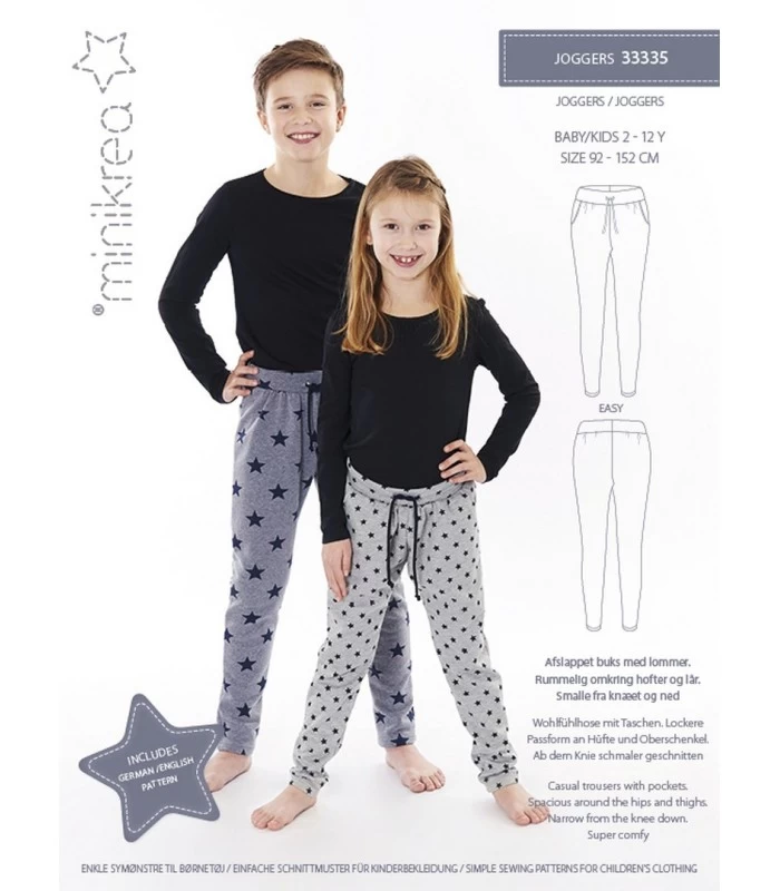 Minikrea 33335 er et klassisk joggers symønster til børn i str. 2-12 år. Komfortable bukser med elastik i taljen - perfekte til hverdagsbrug og bløde matrialer.