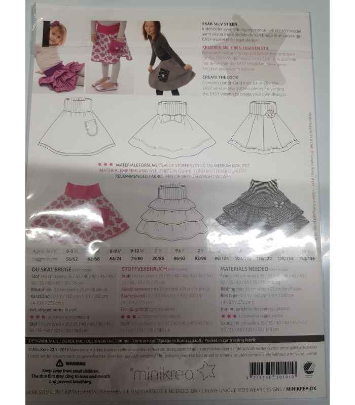 Minikrea 50101 er et klassisk cirkelnederdel symønster til børn i str. 0-10 år. Perfekt med elastik i taljen og flot vidde - ideel til både jersey og fast stof.