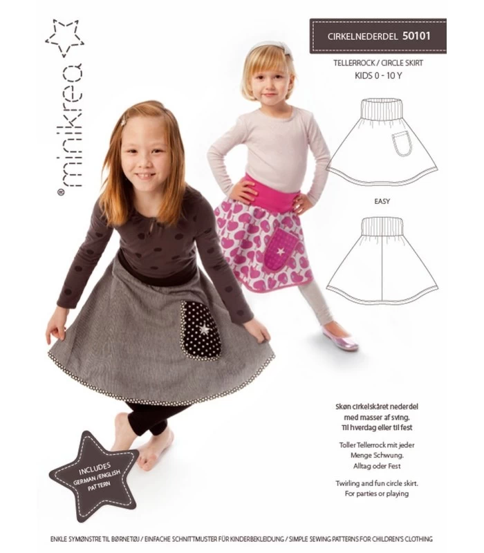 Minikrea 50101 er et symønster til klassisk cirkelnederdel med god vidde og elastik i taljen. Modellen er både komfortabel og nem at tage af og på – perfekt til hverdagsbrug, institution og fest.