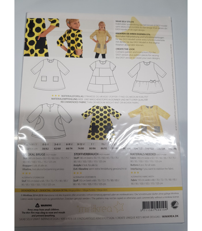 Minikrea 50010 er en klassisk A-line kjole til børn i str. 0-10 år. En behagelig og anvendelig model med flot fald og mulighed for fine detaljer som lommer.