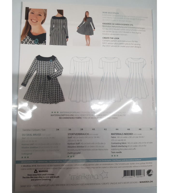 Minikrea 70046 er et fiminint symønster til figursyet damekjole med lange ærmer. Str. 34-50. Perfekt til strækstoffer