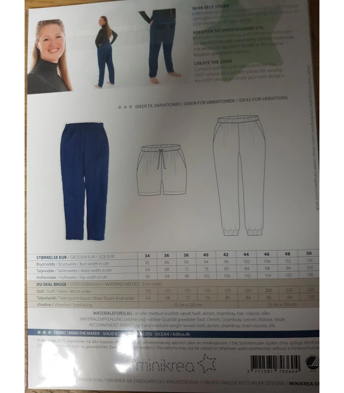 Minikrea 70360 er et symønster til løstsiddende damebukser med elastik i taljen. Str. 34-50. Komfortable og perfekte til vævede stoffer.