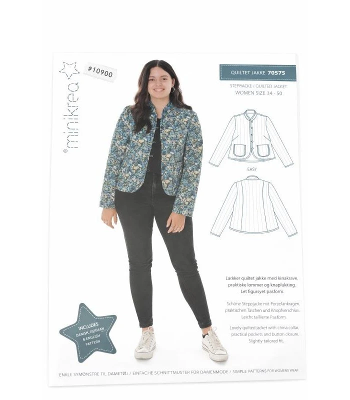 Med dette symønster fra MiniKrea kan du sy en flot og tidløs quiltet jakke til kvinder. Jakken har en elegant kinakrave, praktiske lommer og knaplukning foran.
