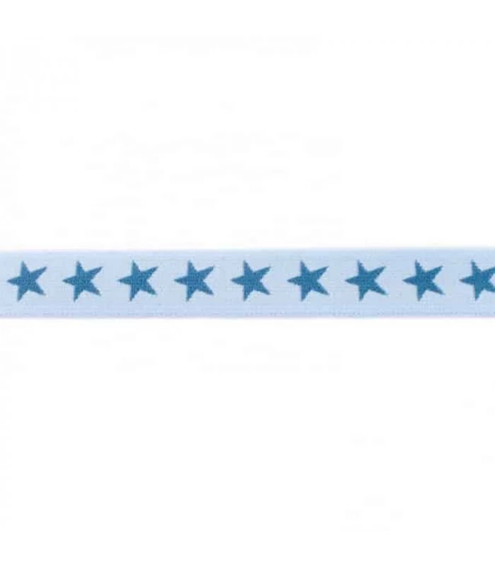 Undertøjselastik 2 cm i lyseblå med blå stjerner. Blød og fleksibel 20 mm elastik – perfekt til undertøj, børnetøj og lette linninger. Sælges pr. meter.