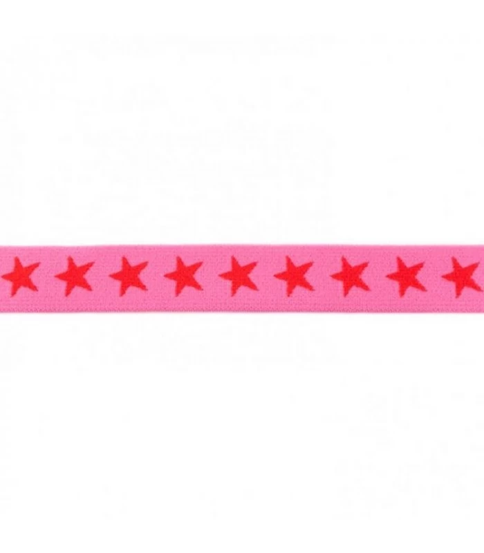 Undertøjselastik 2 cm i pink med røde stjerner. Blød og elastisk 20 mm elastik – perfekt til undertøj, børnetøj og farverige detaljer. Sælges pr. meter.