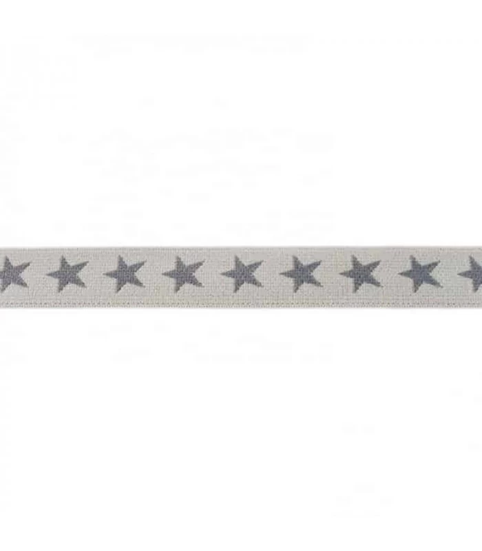 Undertøjselastik 2 cm i lysegrå med grå stjerner. Blød og fleksibel 20 mm elastik – ideel til undertøj, børnetøj og lette linninger. Sælges pr. meter.