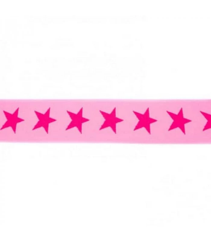 Denne undertøjselastik er 4 cm bred (40 mm) og har et flot ton-i-ton design i lys pink med mørk pink stjerner. Den bløde kvalitet gør elastikken behagelig mod huden og velegnet til både børn og voksne.