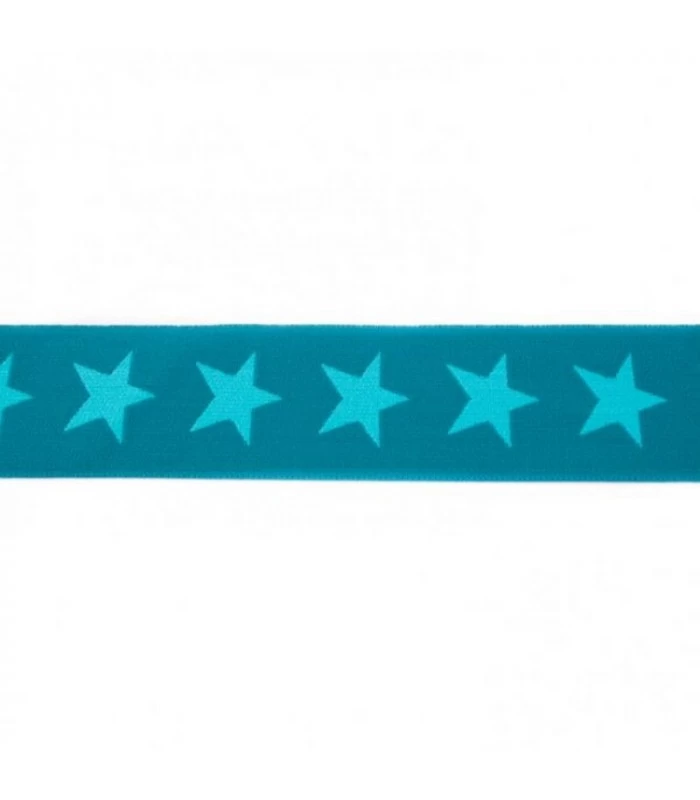 Denne 4 cm (40 mm) brede undertøjselastik har et moderne og frisk design i mørk petrol med turkise stjerner.