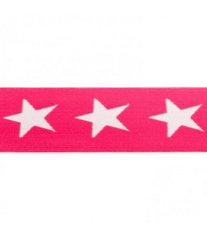 Denne pink undertøjselastik 4 cm bred (40 mm) har et flot mønster med hvide stjerner, som giver et sødt og moderne udtryk til dine syprojekter.