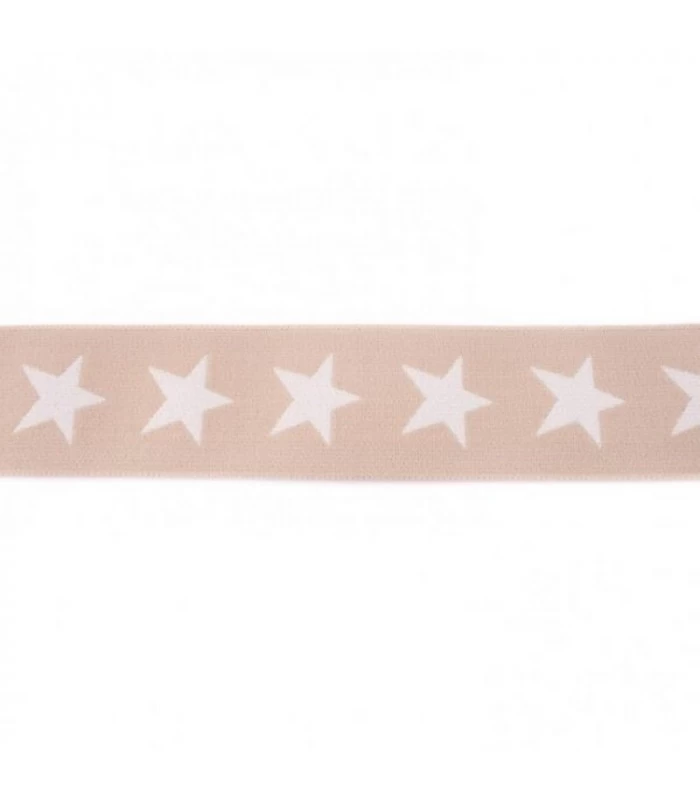 4 cm bred undertøjselastik i sandfarve med hvide stjerner. Blød og fleksibel elastik perfekt til linning i undertøj og børnetøj. Sælges pr. meter.