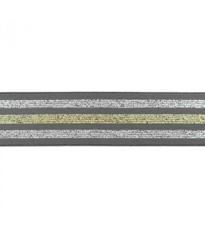 Bred undertøjselastik 40 mm (4 cm) i grå med dekorative guld og sølv striber. Perfekt til undertøj, linning, shorts og sportstøj. Blød og fleksibel kvalitet som er behagelig mod huden. Sælges i metermål.