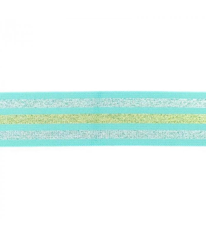 Bred undertøjselastik 40 mm (4 cm) i mint med dekorative guld og sølv striber. Perfekt til undertøj, linning, shorts og sportstøj. Blød og fleksibel kvalitet som er behagelig mod huden. Sælges i metermål.