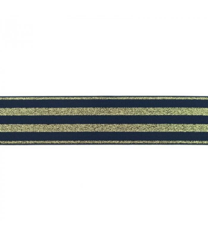 Bred undertøjselastik 40 mm (4 cm) i navy med dekorative guld striber. Perfekt til undertøj, linning, shorts og sportstøj. Blød og fleksibel kvalitet som er behagelig mod huden. Sælges i metermål.