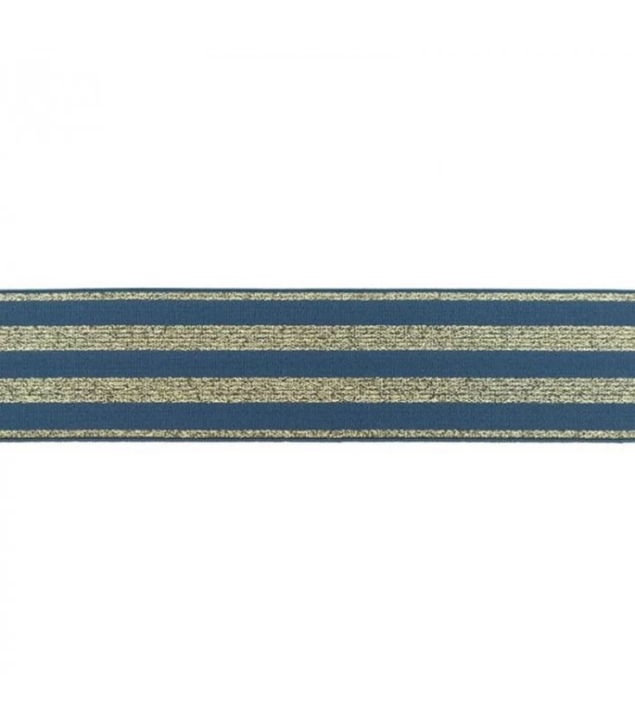 Bred undertøjselastik 40 mm (4 cm) i petrol med dekorative guld striber. Perfekt til undertøj, linning, shorts og sportstøj. Blød og fleksibel kvalitet som er behagelig mod huden. Sælges i metermål.