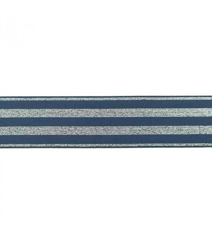 Bred undertøjselastik 40 mm (4 cm) i petrol med dekorative sølv striber. Perfekt til undertøj, linning, shorts og sportstøj. Blød og fleksibel kvalitet som er behagelig mod huden. Sælges i metermål.