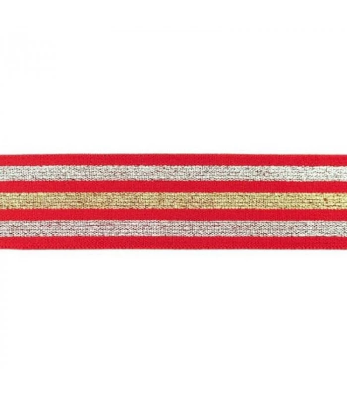 Bred undertøjselastik 40 mm (4 cm) i rød med dekorative guld og sølv striber. Perfekt til undertøj, linning, shorts og sportstøj. Blød og fleksibel kvalitet som er behagelig mod huden. Sælges i metermål.