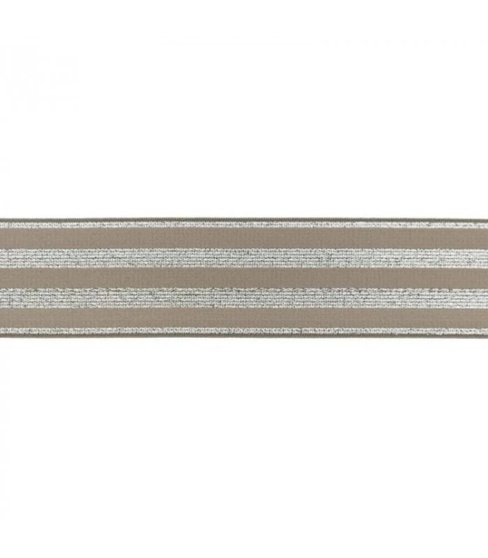Bred undertøjselastik 40 mm (4 cm) i taupe med dekorative sølv striber. Perfekt til undertøj, boxershorts, linning, shorts og sportstøj. Blød og fleksibel kvalitet som er behagelig mod huden. Sælges i metermål.