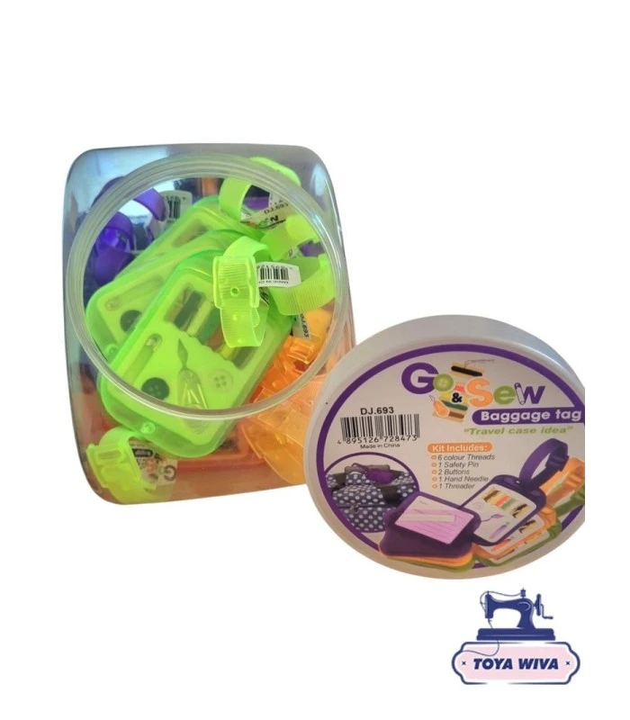 Praktisk mini rejsesysæt med tråd, nål, knapper og sikkerhedsnål. Perfekt til ferien eller små nødsituationer.